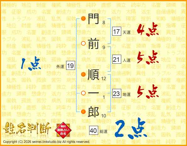 門(8画)前(9画) 順(12画)一(1画)郎(10画)