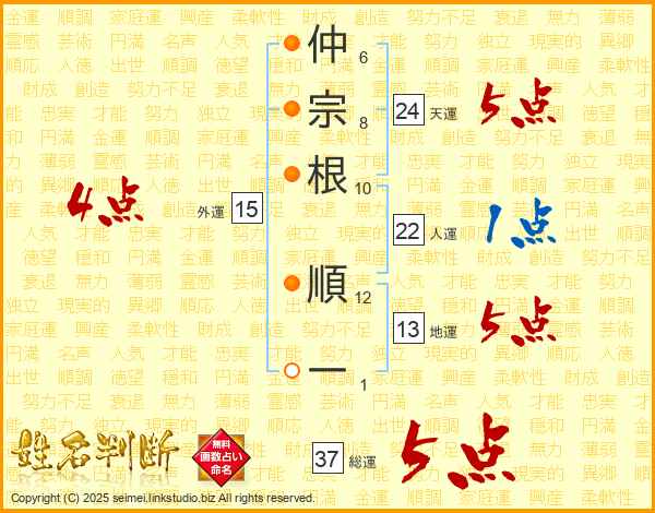 仲(6画)宗(8画)根(10画) 順(12画)一(1画)