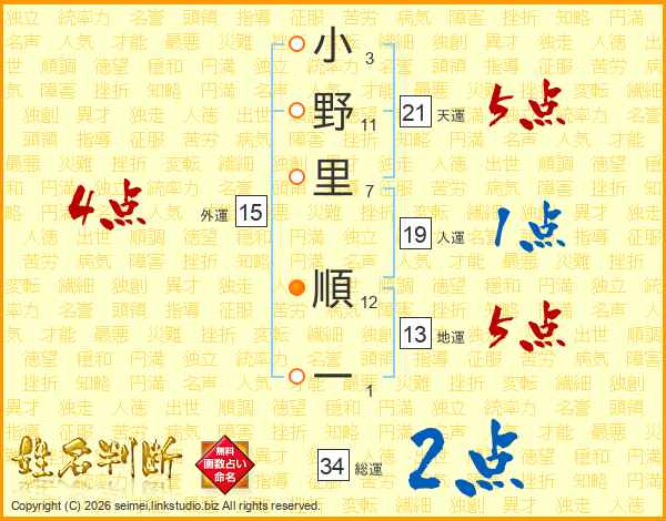小(3画)野(11画)里(7画) 順(12画)一(1画)