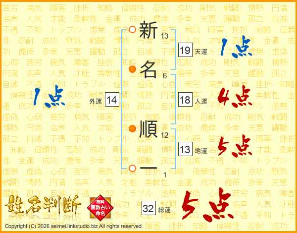 生活面を象徴する運勢です。外部から受ける影響力を表し、結婚運、家庭運や職場、環境への順応性を表します。総運から人運を引いた画数。姓や名が1文字の場合を除く。