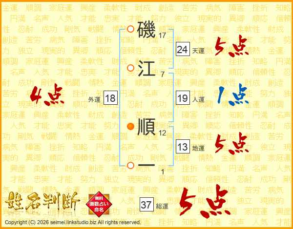 磯(17画)江(7画) 順(12画)一(1画)