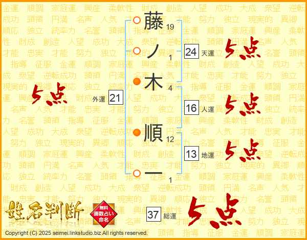 藤(19画)ノ(1画)木(4画) 順(12画)一(1画)