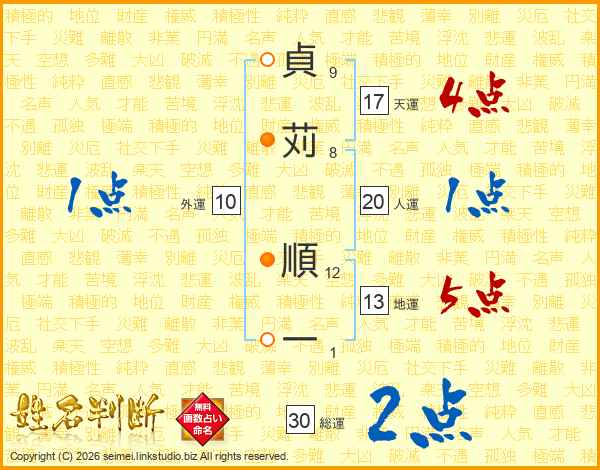生活面を象徴する運勢です。外部から受ける影響力を表し、結婚運、家庭運や職場、環境への順応性を表します。総運から人運を引いた画数。姓や名が1文字の場合を除く。