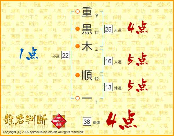 重(9画)黒(12画)木(4画) 順(12画)一(1画)