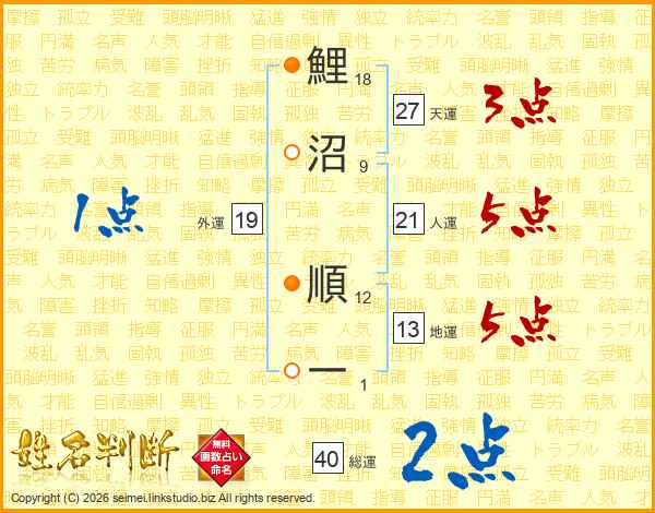 鯉(18画)沼(9画) 順(12画)一(1画)