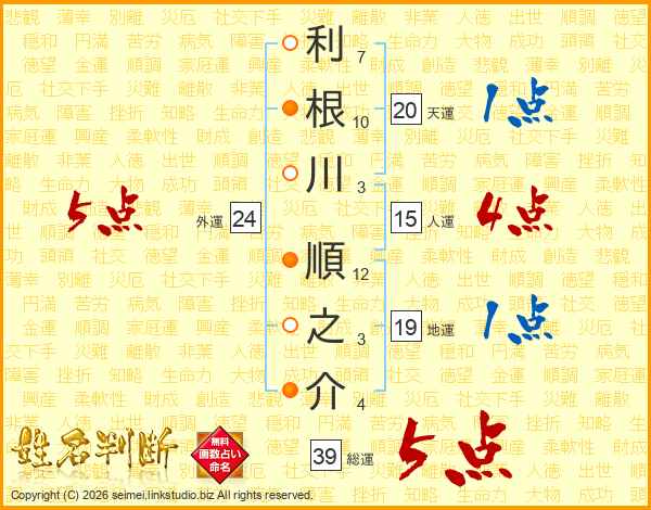 利根川順之介さんの総運は39画の5点!