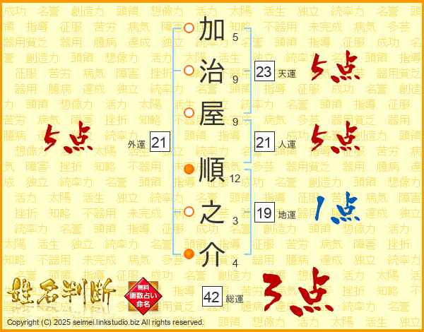 加(5画)治(9画)屋(9画) 順(12画)之(3画)介(4画)