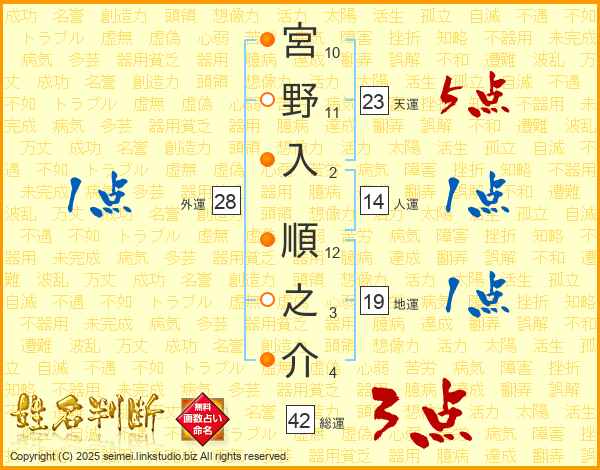 宮(10画)野(11画)入(2画) 順(12画)之(3画)介(4画)