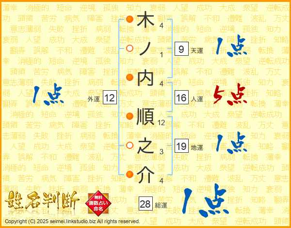 木(4画)ノ(1画)内(4画) 順(12画)之(3画)介(4画)