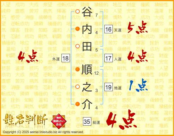 谷(7画)内(4画)田(5画) 順(12画)之(3画)介(4画)