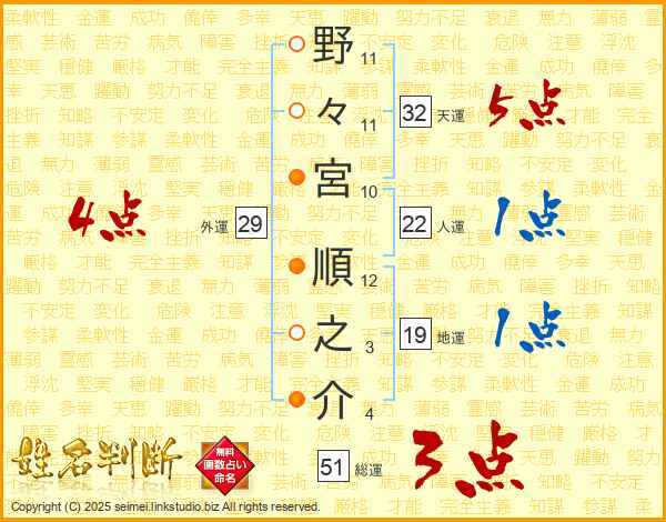野(11画)々(11画)宮(10画) 順(12画)之(3画)介(4画)