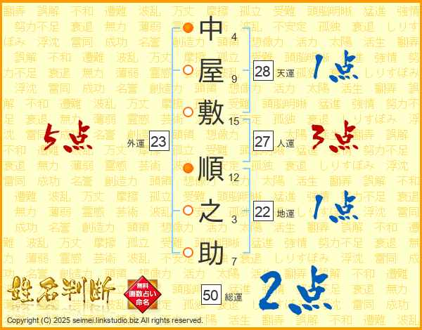 中(4画)屋(9画)敷(15画) 順(12画)之(3画)助(7画)