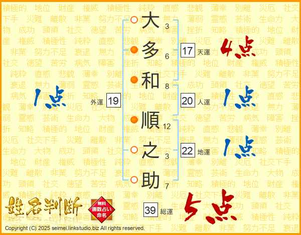 大(3画)多(6画)和(8画) 順(12画)之(3画)助(7画)