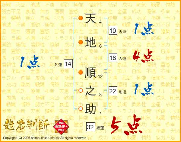 天(4画)地(6画) 順(12画)之(3画)助(7画)