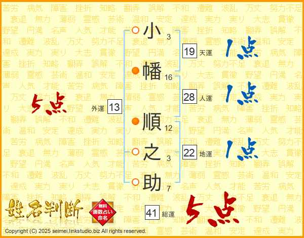 小(3画)幡(16画) 順(12画)之(3画)助(7画)