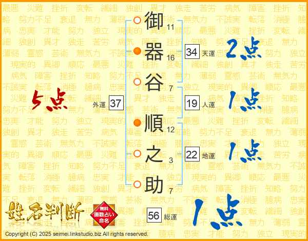 御(11画)器(16画)谷(7画) 順(12画)之(3画)助(7画)