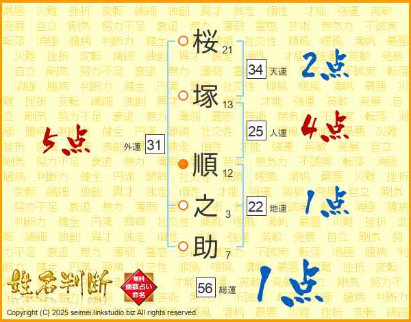 桜(21画)塚(13画) 順(12画)之(3画)助(7画)