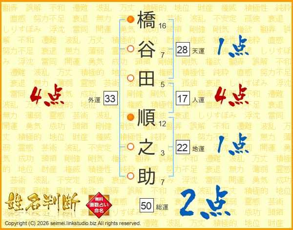 橋(16画)谷(7画)田(5画) 順(12画)之(3画)助(7画)