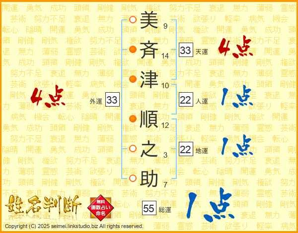 美(9画)斉(14画)津(10画) 順(12画)之(3画)助(7画)