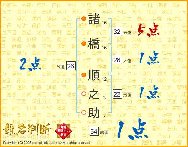 諸(16画)橋(16画) 順(12画)之(3画)助(7画)
