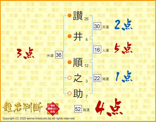 讃(26画)井(4画) 順(12画)之(3画)助(7画)