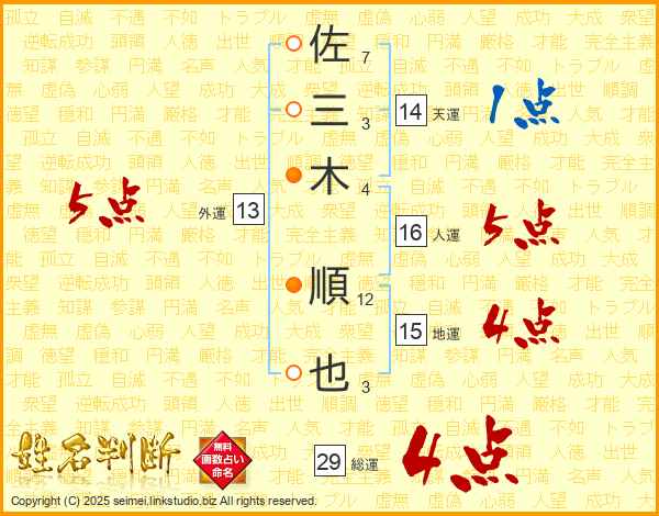 佐(7画)三(3画)木(4画) 順(12画)也(3画)