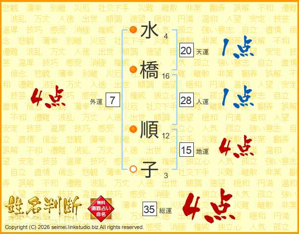 水(4画)橋(16画) 順(12画)子(3画)