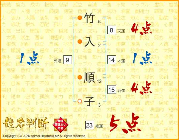 生活面を象徴する運勢です。外部から受ける影響力を表し、結婚運、家庭運や職場、環境への順応性を表します。総運から人運を引いた画数。姓や名が1文字の場合を除く。