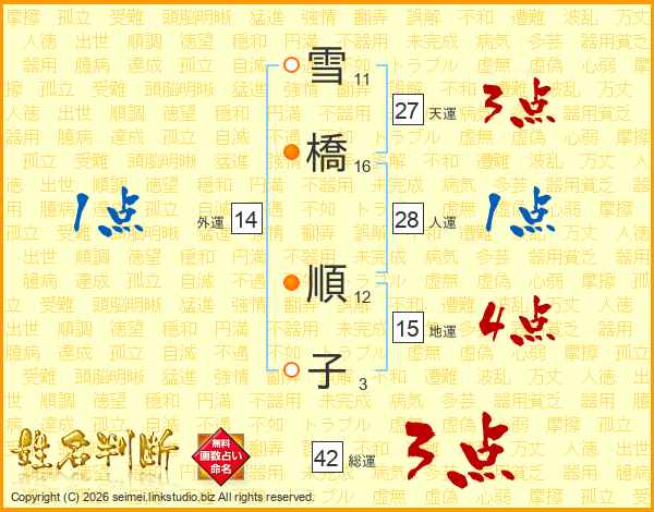あなたの人生を表す1番重要な運勢です。生涯を通じて影響する総合運となり、主に50歳以降の晩年期に影響を及ぼします。苗字と名前の合計画数。