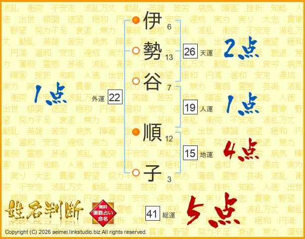 伊(6画)勢(13画)谷(7画) 順(12画)子(3画)