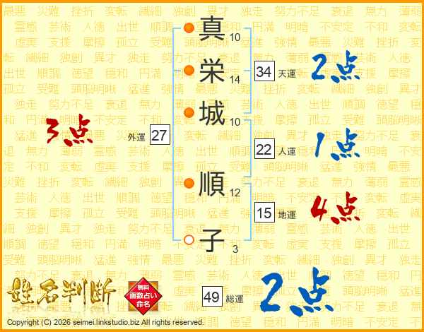 真(10画)栄(14画)城(10画) 順(12画)子(3画)