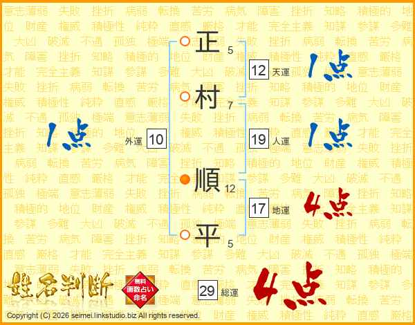 正(5画)村(7画) 順(12画)平(5画)