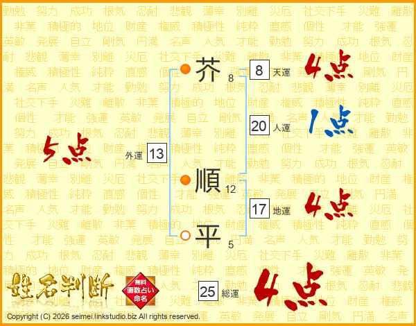 生活面を象徴する運勢です。外部から受ける影響力を表し、結婚運、家庭運や職場、環境への順応性を表します。総運から人運を引いた画数。姓や名が1文字の場合を除く。
