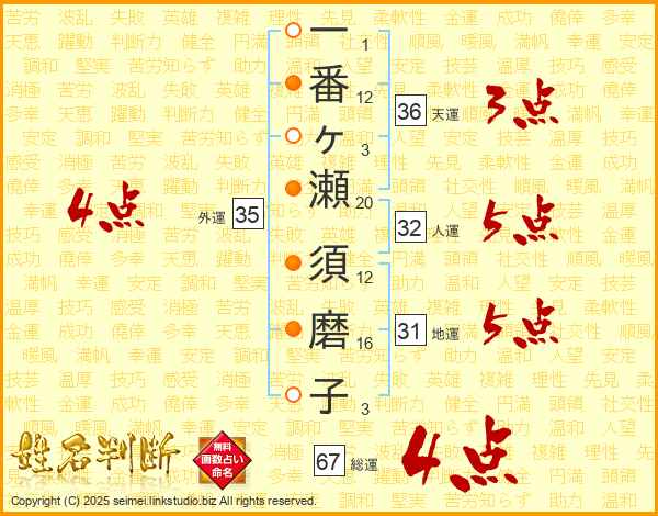 一番ヶ瀬須磨子さんの総運は67画の4点!