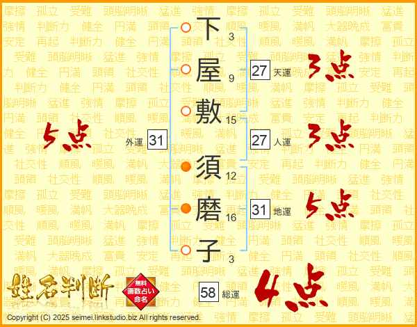 下(3画)屋(9画)敷(15画) 須(12画)磨(16画)子(3画)