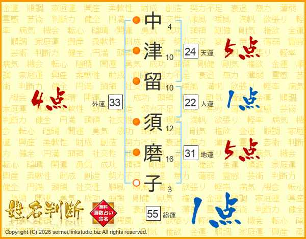 中津留須磨子さんの外運は33画の4点!