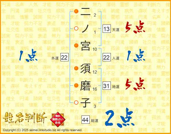 二(2画)ノ(1画)宮(10画) 須(12画)磨(16画)子(3画)