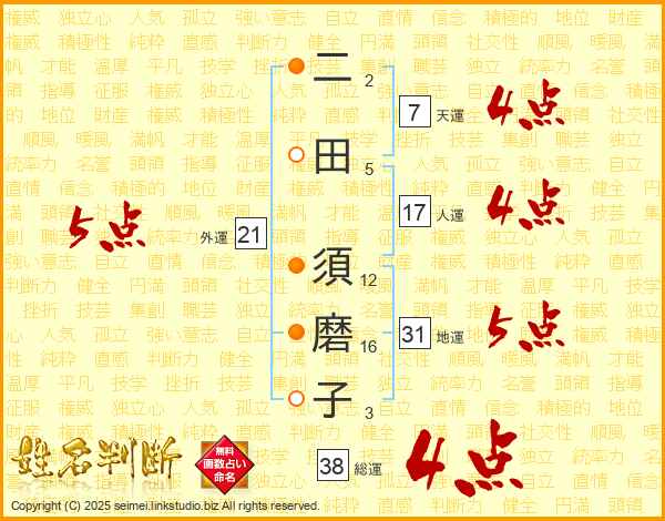 生活面を象徴する運勢です。外部から受ける影響力を表し、結婚運、家庭運や職場、環境への順応性を表します。総運から人運を引いた画数。姓や名が1文字の場合を除く。