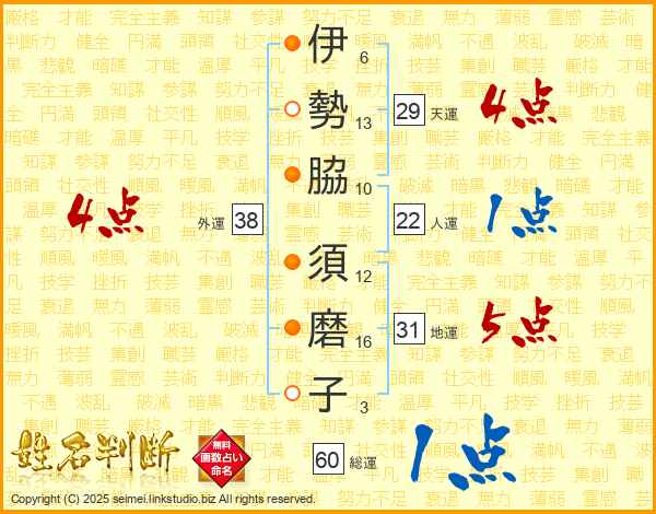 伊(6画)勢(13画)脇(10画) 須(12画)磨(16画)子(3画)