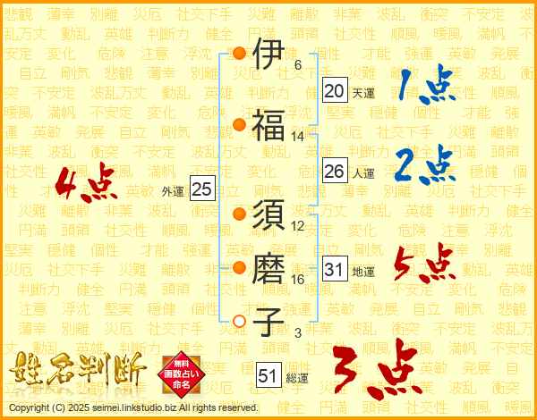 伊(6画)福(14画) 須(12画)磨(16画)子(3画)
