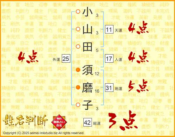 小(3画)山(3画)田(5画) 須(12画)磨(16画)子(3画)