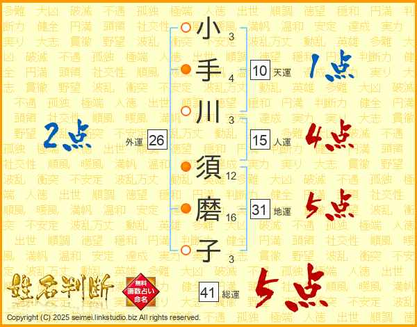 小(3画)手(4画)川(3画) 須(12画)磨(16画)子(3画)
