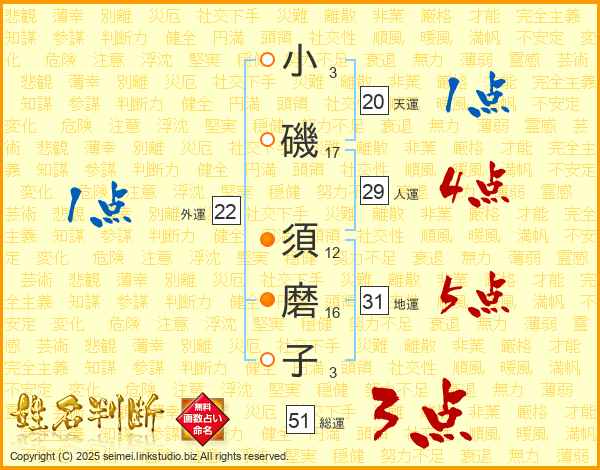 小(3画)磯(17画) 須(12画)磨(16画)子(3画)