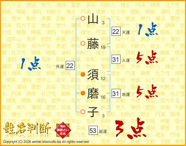 山(3画)藤(19画) 須(12画)磨(16画)子(3画)