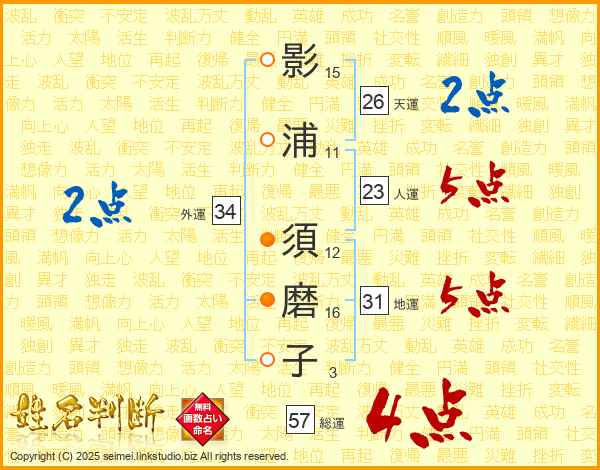 影(15画)浦(11画) 須(12画)磨(16画)子(3画)
