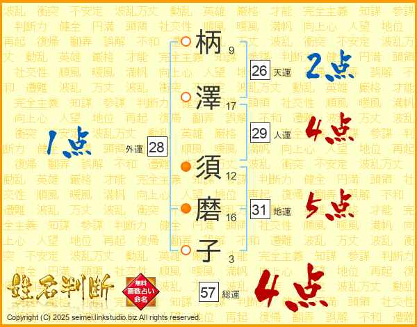 柄(9画)澤(17画) 須(12画)磨(16画)子(3画)