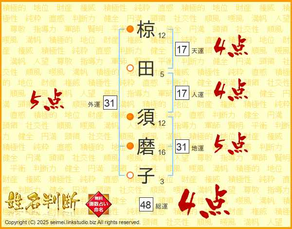 椋(12画)田(5画) 須(12画)磨(16画)子(3画)