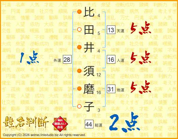 比(4画)田(5画)井(4画) 須(12画)磨(16画)子(3画)