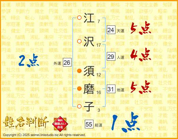 江(7画)沢(17画) 須(12画)磨(16画)子(3画)
