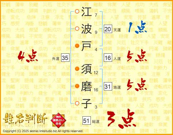 江(7画)波(9画)戸(4画) 須(12画)磨(16画)子(3画)